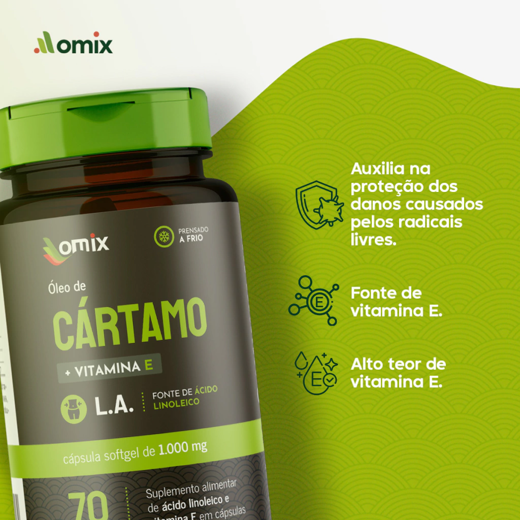 O Óleo de Cártamo com Vitamina E em cápsulas da Omix combina óleo de cártamo e vitamina E, proporcionando uma fonte de ácidos graxos essenciais e antioxidantes. Cada cápsula contém 1g de óleo de cártamo e 10mg de vitamina E, ideal para complementar uma alimentação equilibrada.